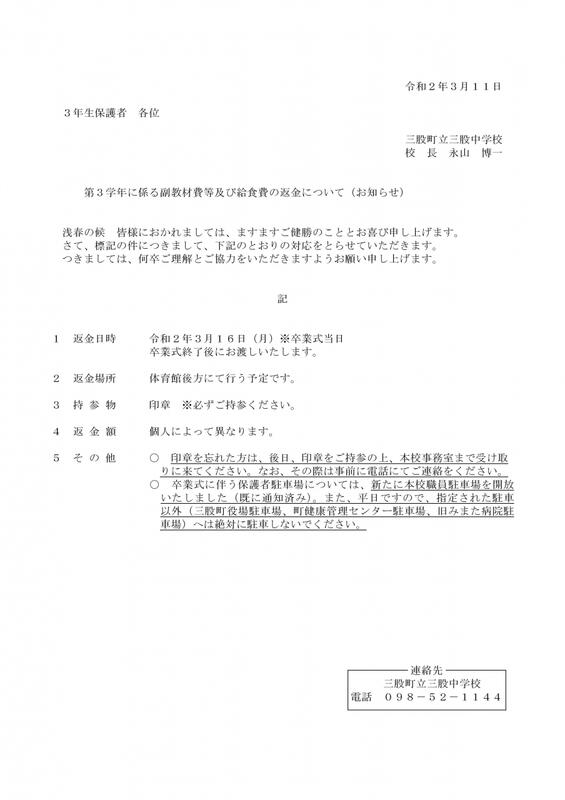 第3学年の副教材費等及び給食費の返金について 投稿日時 : 2020/03/11 三股中学校 標記の件につきましてお知らせいたします。何卒、ご理解とご協力をお願いします。特に卒業式に伴う保護者駐車場については、本校の重要な課題となっておりますので、重ねてお願い申し上げます。返金等について【3年生】.pdf