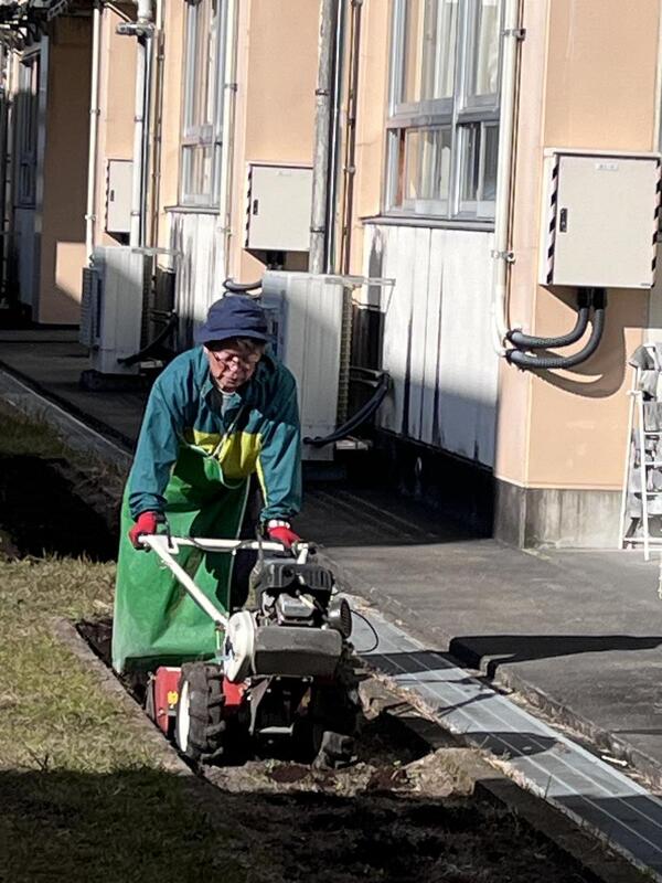 さて、修学旅行明けの校内を見てみると、花壇を丁寧に耕うんされる技術員の野瀨さんが、懸命に1年生の教室前や体育館前の花壇の土をきれいにされていました。ここにきれいな花が育つのです。