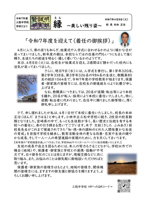 私は、本年度、三股中学校校長を拝命いたしました 本田 正治(ほんだ まさはる)と申します。保護者のみなさまや地域の方々に支えられ、歴史と伝統を受け継ぐ本校に携わることに大きな喜びを感じております。その一方で、与えられた責任の重さに身の引き締まる思いもあります。