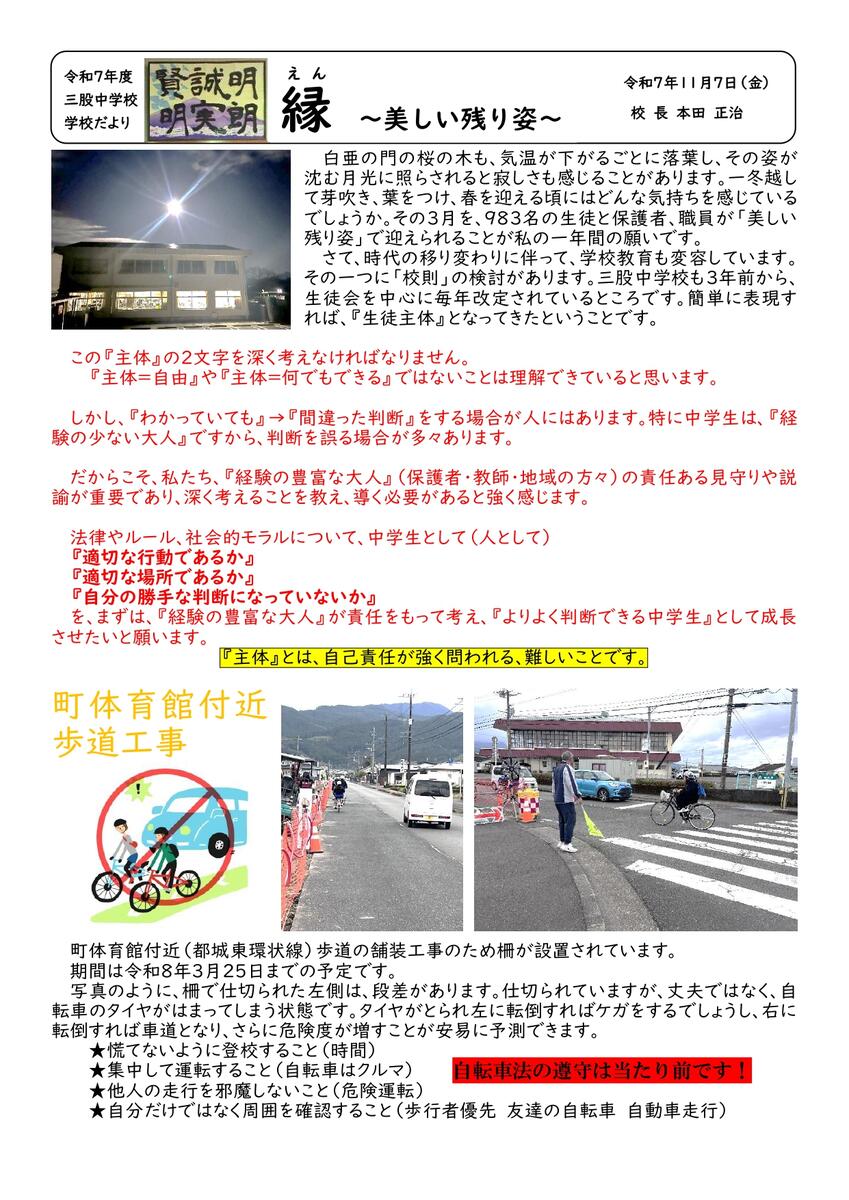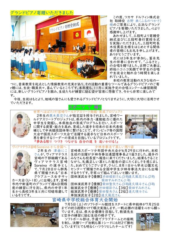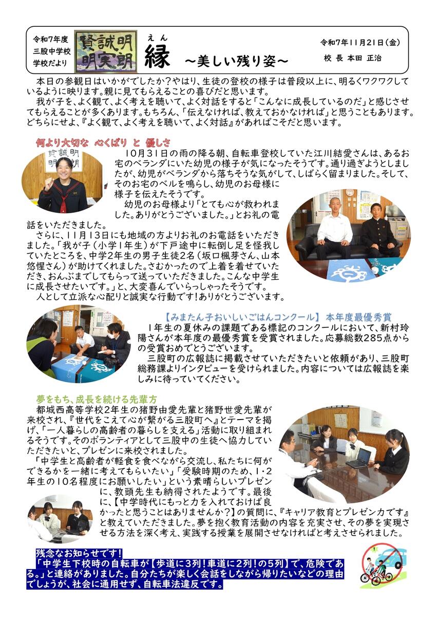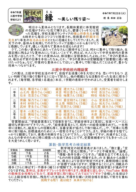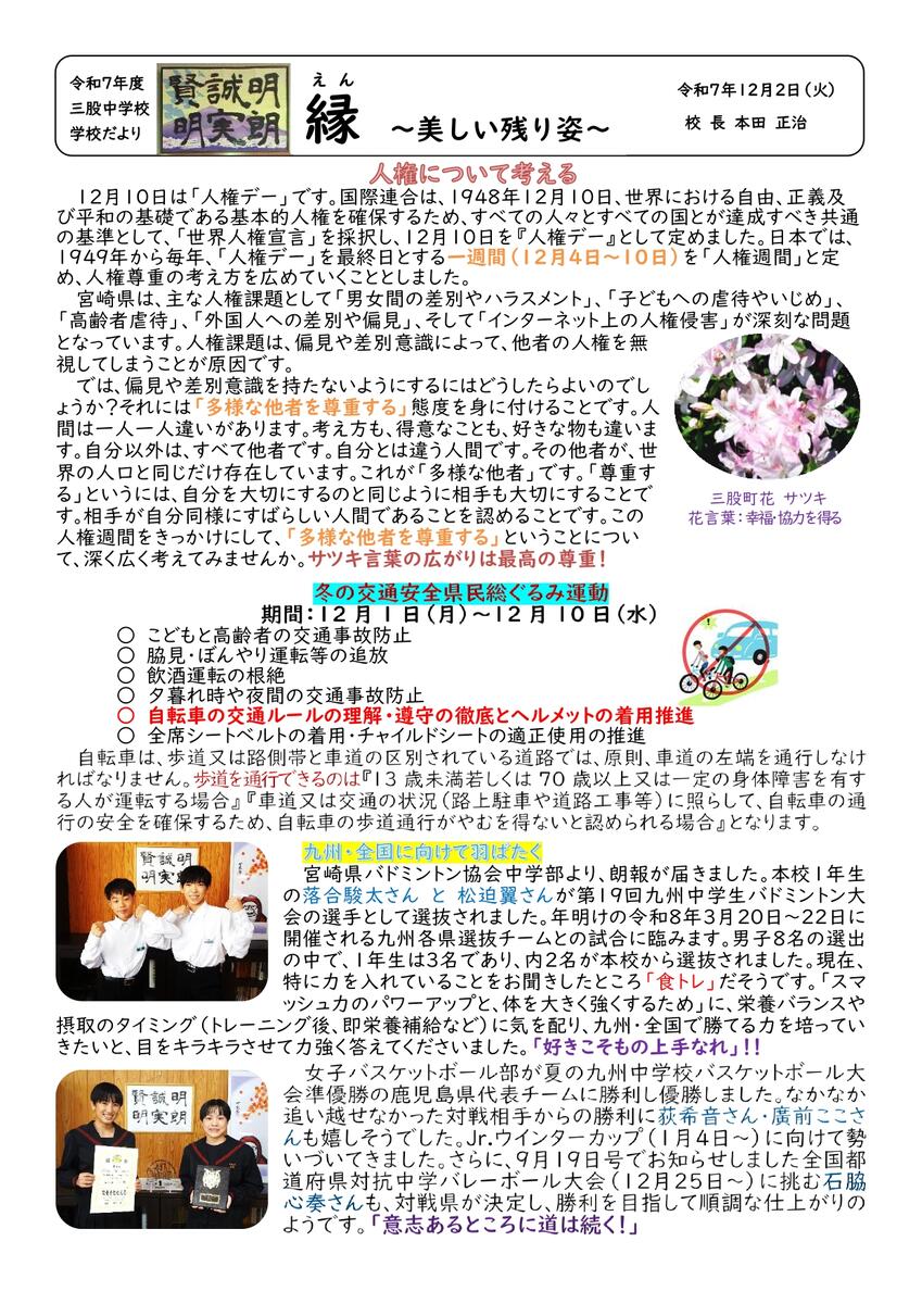 変化が激しく、こたえがひとつではない多様性が求められる社会の中で、心身ともに健康で文化的な社会生活を営むことができるよう、日々の教育活動を充実させ、三股中学校の生徒が「自分が大事 友達が大切 学校が大好き」と思える生徒になってほしいと考えています。
