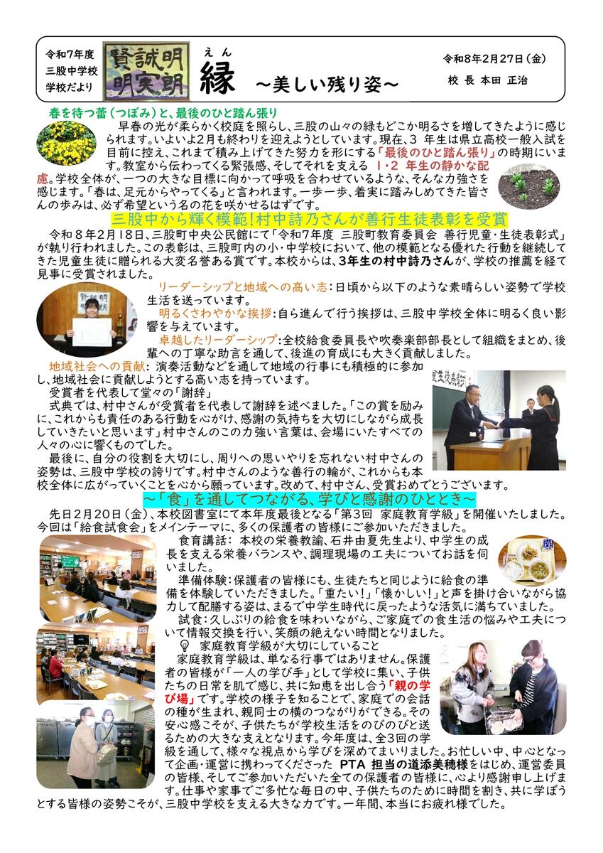 どうぞ、保護者のみなさま、地域のみなさま、984名の生徒と、80名の教職員へあたたかいご支援とご協力をよろしくお願いいたします。
