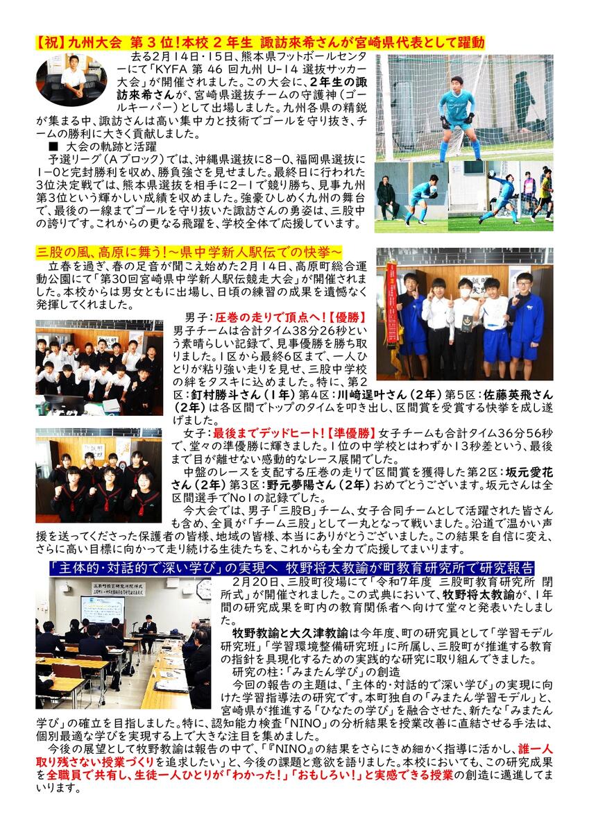 変化が激しく、こたえがひとつではない多様性が求められる社会の中で、心身ともに健康で文化的な社会生活を営むことができるよう、日々の教育活動を充実させ、三股中学校の生徒が「自分が大事 友達が大切 学校が大好き」と思える生徒になってほしいと考えています。