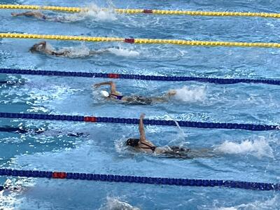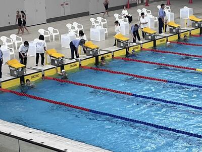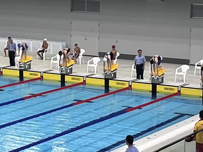 「パーソルアクアパーク宮崎」国スポに合わせて準備された新しい水泳競技場で県大会(水泳競技)が開催されました。50Mと100Mの自由形に大﨑月愛さんが出場しました。6組中の最終組(6組目の一番タイムの速い組)で華麗なスイムを披露しました。