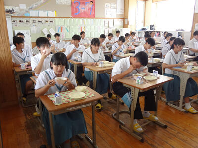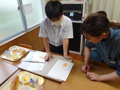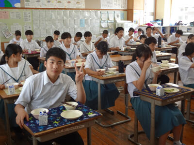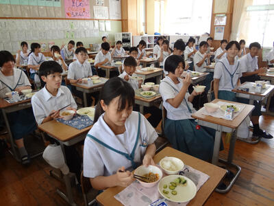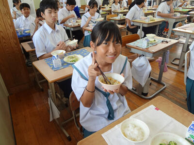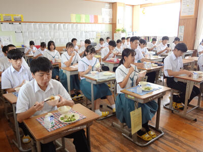学校では、毎日の給食時間に放送委員会が給食の栄養やメニューをお知らせし、食事の大切さを伝えています。