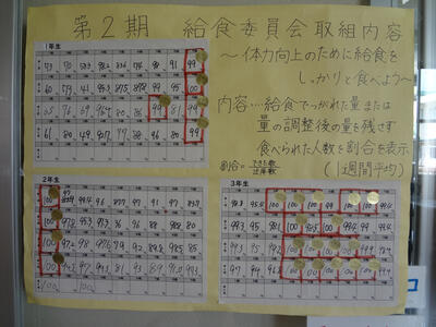 本日も暑い一日となりました。暑さに負けぬ体作りは、食事と運動!+睡眠(休養)です。給食委員会は、体作りとSDGsの観点から、残食調査を実施しました。残さなかった学級に金賞シールです。給食無償の本校だからこそ力を入れるべきであると考えます。栄養と運動で元気な体!「元気があれば何でもできる」。