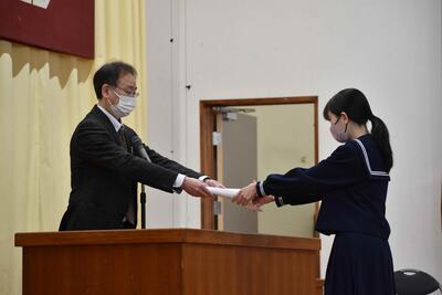 12月24日(水)、2学期の終業式が行われました。式に先立ち行われた表彰では、延べ16名もの生徒が校長先生から表彰状を受け取りました。また、検定合格者への証書授与や英単語コンテスト満点者でも30名以上紹介されました。様々な分野での生徒たちの頑張りを全校生徒で讃えました。