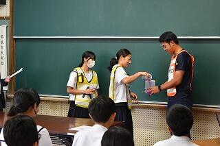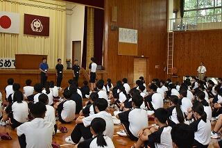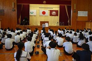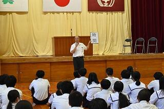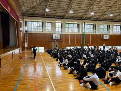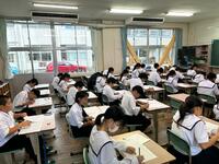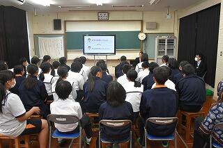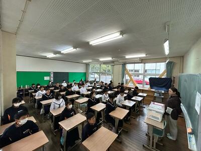 生徒たちは、戦争の恐ろしさを知るとともに、二度と繰り返してはならない歴史であることを改めて感じ取り、真剣に耳を傾けていました。最後に、竹原先生から「勇気をもって、何事にも挑戦してほしい」と温かいメッセージをいただき、学びを深める貴重な時間となりました。