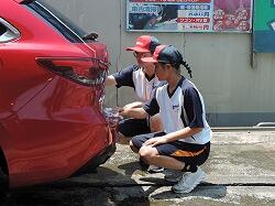 グランドへ避難したあとに、消火器の扱い方をヤマトボーデンさんに教えてもらい、代表生徒による消火訓練を行いました。