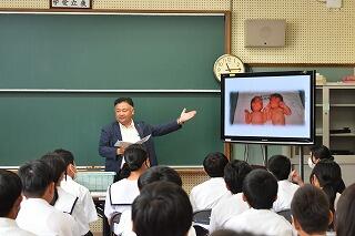 11月7日(金)、1年生を対象に、都城市保健センターが主催する「産婦人科による出前授業」が行われました。産婦人科医の谷口先生をお迎えし、子宮頸がんなどに関する最新の知識を専門的な立場から、わかりやすく教えていただきました。