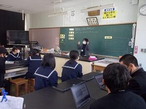 1月26日(水)の5校時に、研究授業を実施しました。校内研修の取組の一つで、平成30年度から、全ての先生方が年1回の研究授業を行っています。今回は、1年国語科、2年理科・保健体育科の授業でした。本年度の研究の柱であるアウトプット及びICT活用が位置付けられた授業が展開されました。授業後のワークショップ型授業研究会も熱心に協議がなされました。