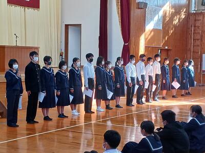 12月24日(金)に、2学期の終業式を行いました。終業式では、各学年及び生徒会の代表者が、2学期の反省と今後の抱負を発表しました。終業式後に、学習、保健、生徒指導の担当の先生から、冬休みの生活に関するお話がありました。自分や大切な人の命を守るために、よく考えて生活しましょう。家庭での学習もしっかり行い、有意義な冬休みになることを期待しています。