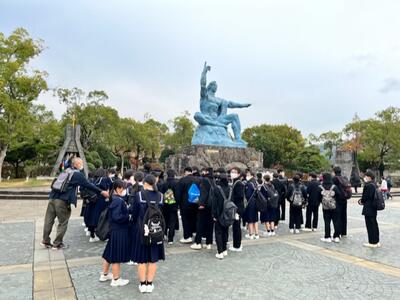 平和式典では全員で心を込めて準備をした千羽鶴を奉納し、平和を祈って黙祷を捧げました。また、長崎原爆資料館や記念碑を訪れ、生徒は原爆の恐ろしさや平和の大切さを間近に感じることができました。