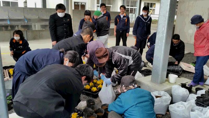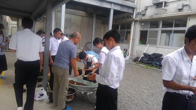 この活動は、地域の高齢者との交流を深めることなどを目的に毎年続けており、今年で15回目である。生徒たちは、3月下旬に種をまき、植え替えや毎日の水やりなど世話を続けてきた。7月6日は、数人の班に分かれて、各地域の高齢者を一軒一軒訪問した。(T)