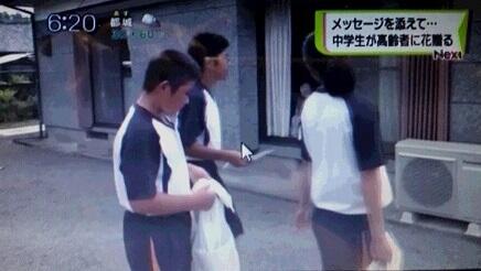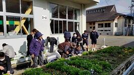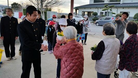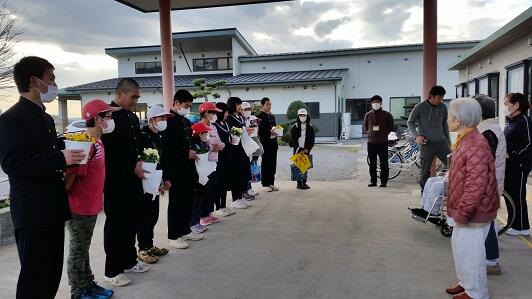 小中学生が、「花配り活動」をとおして、自分たちが栽培した花を高齢者に届け、地域の高齢者とのふれあいを行いました。(T)