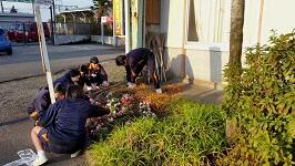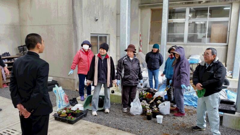 地区の民生児童委員の皆様と一緒に高齢者の方々の家の確認や配付分担、花の移植を