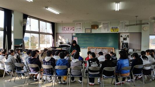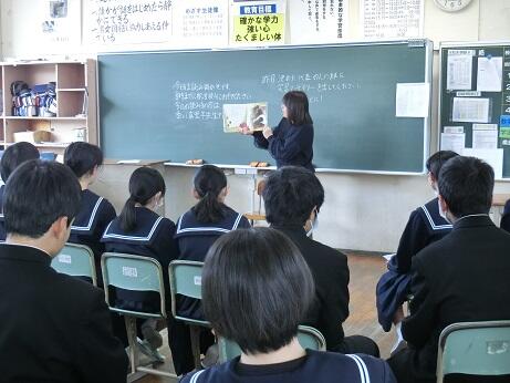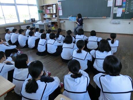 本校の保護者を中心に、6名の読書ボランティアの方々に協力してもらい、朝の時間に生徒達に読み聞かせを行っています。(T)