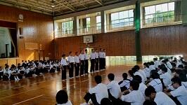 いよいよ明日(9日)から都城地区中学校総合体育大会です。すでに陸上・水泳は終わっており、本校からも3名が出場しました。3名ともに一生懸命に競技に臨む姿がみられました。県大会出場につきましては後日お知らせしたいと思います。推戴式では、各部の主将が、県大会出場や地区優勝を目標に、支えてくれた方々に感謝の気持ちをもって、全力でプレイしたいとの強い意気込みを述べてくれました。明日からの結果や途中経過については、このホームページで紹介紹介しますので、ご覧ください。
