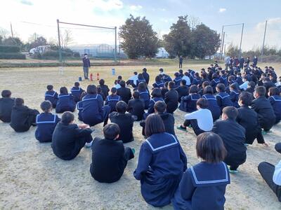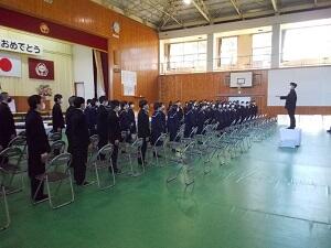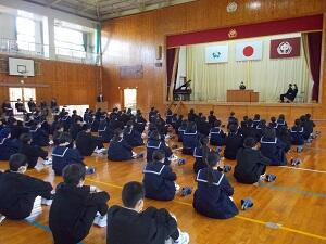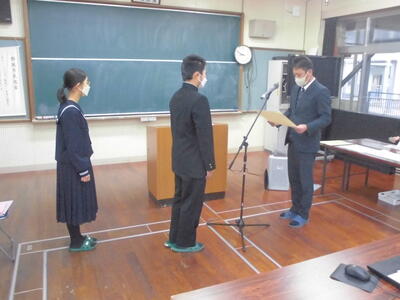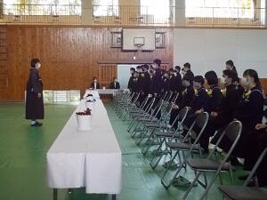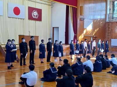 3月25日(金)に修了式を行いました。各学年及び生徒会の代表者が、1年間の反省と新年度の抱負を発表しました。式後に、学習、保健、生徒指導の担当の先生から、春休みの生活についてのお話がありました。自分や大切な人の命を守るために、よく考えて生活しましょう。有意義な春休みになることを期待しています。