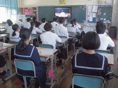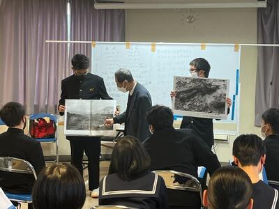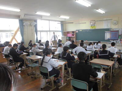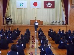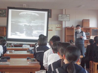 12月の修学旅行で長崎を訪れる2年生は、11月25日(金)に鶴田校長先生による平和学習を行いました。