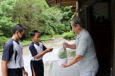 校内で花を育て、7月にはメッセージといっしょに校区内の高齢者の方々に配ってまわります。
