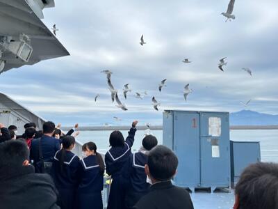熊本県から長崎県までは、フェリーでの移動でした。移動中はかもめにカッパえびせん(エサ)をやるなど、楽しんでいる様子でした。