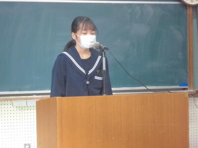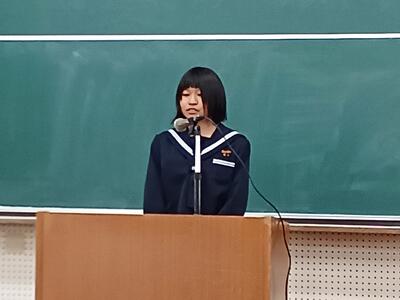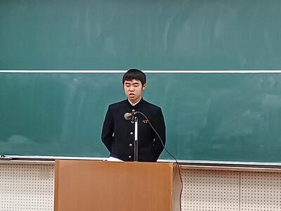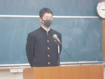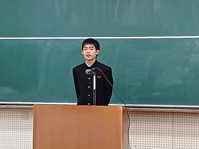 各学年・生徒会の代表生徒が、学習面、部活動、生徒会活動、次の学年や受験・卒業へ向けて等「3学期の抱負」を発表しました。