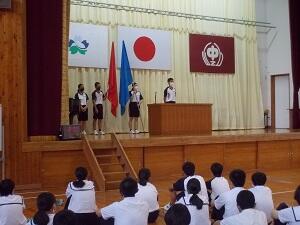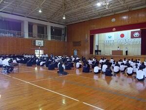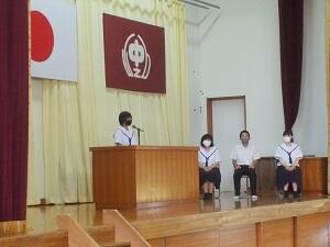 7月21日(水)に1学期の終業式を行いました。終業式では、各学年及び生徒会の代表者が、1学期の反省と今後の抱負を発表しました。式後に、学習、保健、生徒指導の担当の先生から、夏休みの生活についてのお話がありました。自分や大切な人の命を守るために、よく考えて生活しましょう。有意義な春休みになることを期待しています。