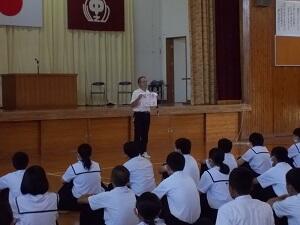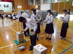 本年度は、選挙を実施するにあたり、都城市選挙管理委員会の方から出前授業として、選挙の意義や現状などについてお話をしていただきました。現在、18歳から選挙権が与えられており、若い世代の投票率が低いことも社会的な問題として取り上げられました。18歳になったら、選挙へ行きましょう。