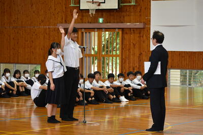 5月27日(月)に地区中学校総合体育大会の推戴式を行いました。各部のキャプテンが抱負を発表しました。