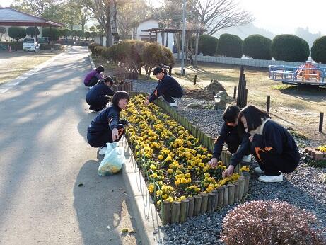 下富吉地区芸能保存会の方と一緒に、生徒達が花植の作業を行いました。