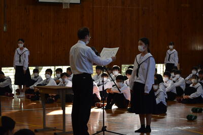10月16日(月)の活動の時間に表彰集会と県中学校秋季体育大会推戴式を行いました。