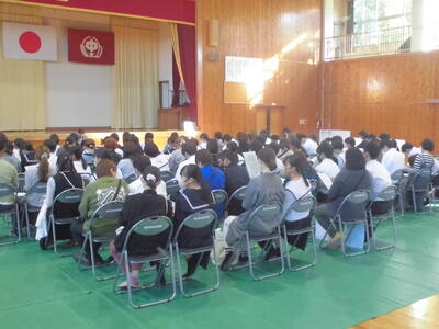 全校生徒から期待を込めた拍手が送られました。これから1年間山之口中のリーダーとして、みんなを引っ張って行ってください。よろしくお願いします。