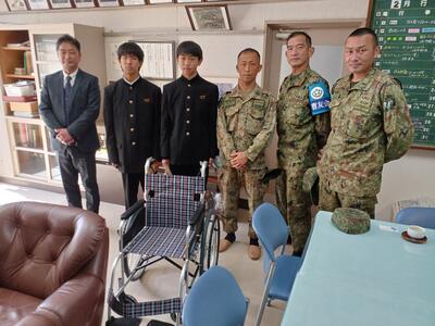 また、2/16(木)には、陸上自衛隊都城駐屯地に所属されている隊員の方々から本校に車いすを寄贈していただきました。チャリティー活動で得た収益金から車いすを購入し、各団体に寄付されているそうです。