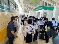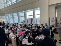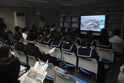 陸上競技場の中に入ることはできませんでしたが、工事に携わっている方から、これまでの工事の様子や広さが山之口中学校の約7.7倍あること、メインスタンドには高さ約30mのドーム型の屋根が付くこと、2027年の国民スポーツ大会・全国障害者スポーツ大会の開会式や陸上競技の会場になることなどを話していただきました。