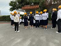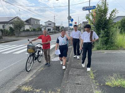 朝 各自の出身小学校で、小学生と先生方・地区の方々と一緒にあいさつ運動をしました。