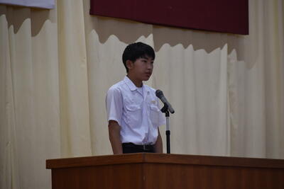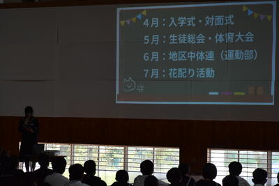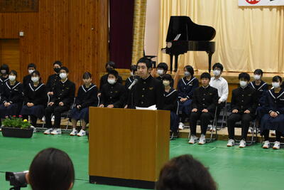 ↑ 新生徒会役員が紹介され、新生徒会長があいさつを行いました。