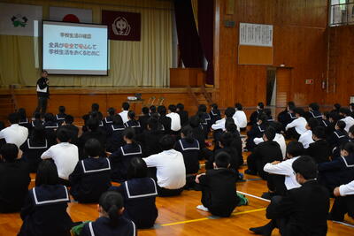 校内や校外での自転車のルールを全校生徒で確認しました。