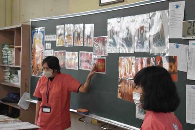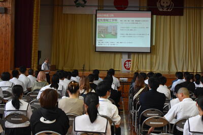 都城歯科医師会より4名の歯科衛生士の方に来ていただき、口腔衛生の重要性について説明していただいたあとに、効果的な歯磨きの仕方の指導をしていただきました。