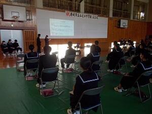 2月17日(木)の総合的な学習の時間に、1年生を対象とした職業講話を実施しました。講師として、宮崎花ふぶき一座の座長である 宮田わかな 様にご来校いただき、「チャレンジの連続のおはなし」と題して、お話をしていただきました。生徒は、真剣にしかも楽しそうに話を聞いていました。ご講話いただき、ありがとうございました。