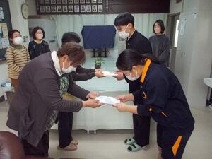 3月11日(金)に、山之口地区の更生保護女性会の皆様から、卒業生に記念品をいただきました。手作りのノートと手編みの食器洗い用具などです。卒業生に贈るメッセージも添えられています。大切に使ってください。