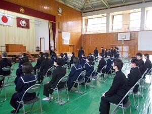 3月25日(金)に修了式を行いました。各学年及び生徒会の代表者が、1年間の反省と新年度の抱負を発表しました。式後に、学習、保健、生徒指導の担当の先生から、春休みの生活についてのお話がありました。自分や大切な人の命を守るために、よく考えて生活しましょう。有意義な春休みになることを期待しています。
