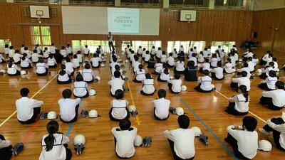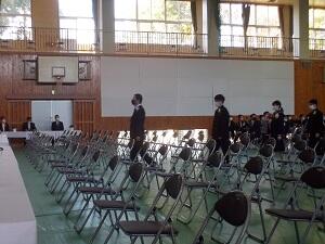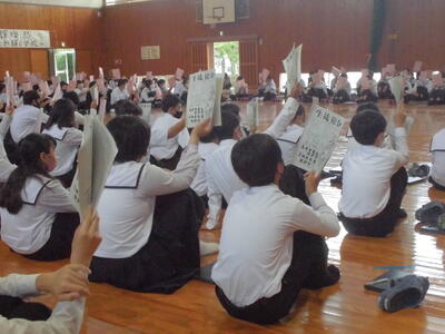 新型コロナウイルス感染拡大防止のため、2・3年生は入学式の会場に入れなかったので初めて全校生徒がそろう場となりました。
