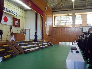 3月16日(水)に、規模縮小、時間短縮ではありますが、第75回卒業式を行いました。卒業式は、卒業証書授与、学校長式辞、記念品贈呈、在校生送辞、卒業生答辞、校歌斉唱を行い、約50分で終了しました。その後、各学級で最後の学級活動を行い、下校となりました。
