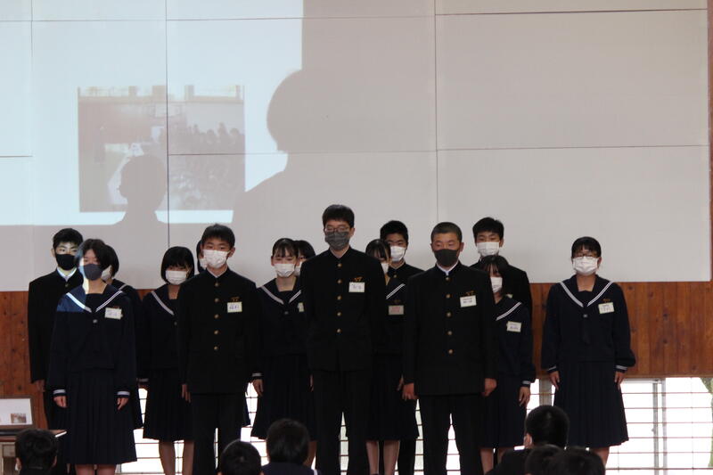 そして、新生徒会役員の皆さん、山之口中学校生徒会の伝統を受け継ぎ、更なる進歩・発展をよろしくお願いします。