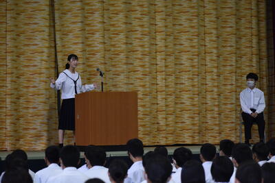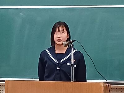 各学年・生徒会の代表生徒が、学習面、部活動、生徒会活動、次の学年や受験・卒業へ向けて等「3学期の抱負」を発表しました。
