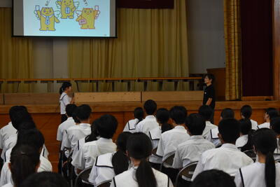 説明会では、校長先生のあいさつの後に、生徒会による学校の行事と生徒会活動の紹介がありました。