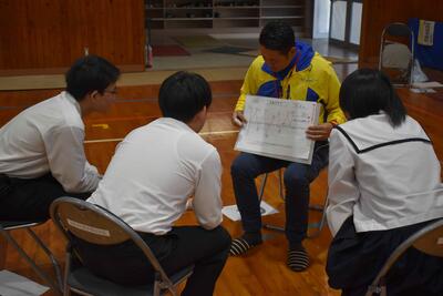 地域の方1名と生徒2~3名でグループを組み、自己紹介の後に、人生グラフを使って地域の方に人生について語っていただきました。