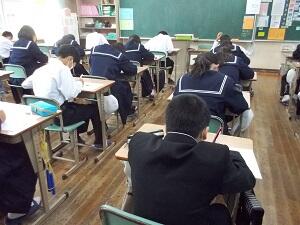 本校では、学力向上を目的として、1・2年生を対象に年5回の学力向上テストを朝自習の時間を活用して実施しています。国語・社会・数学・理科・英語の5教科で計画され、基本的な事項に関するものを出題します。今回は4回目で、1年生は社会、2年生は理科が実施されました。みんな満点をめざして取り組んでいました。