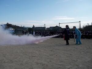 1月9日(木)6校時に、避難訓練(火災)を行いました。調理室から出火したとの想定で、運動場へ避難しました。その後、初期消火の訓練も行いました。株式会社ヤマトボーデンの方から、消火器の使用方法を説明していただき、各学年の代表生徒が実際に消火器で火を消す訓練をしました。