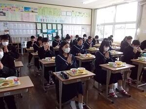 給食では、感染拡大防止の観点から、グループを作らず、全員同じ方向を向いて食べるようにしています。久しぶりの給食をおいしそうに食べていました。